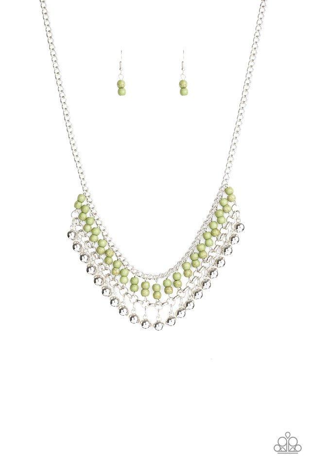Enhebradas a lo largo de delicadas varillas de plata, las pilas de cuentas de piedra verde dan paso a una hilera de cuentas de plata brillante, creando una franja terrosa debajo del collar. Cuenta con un cierre de broche ajustable.