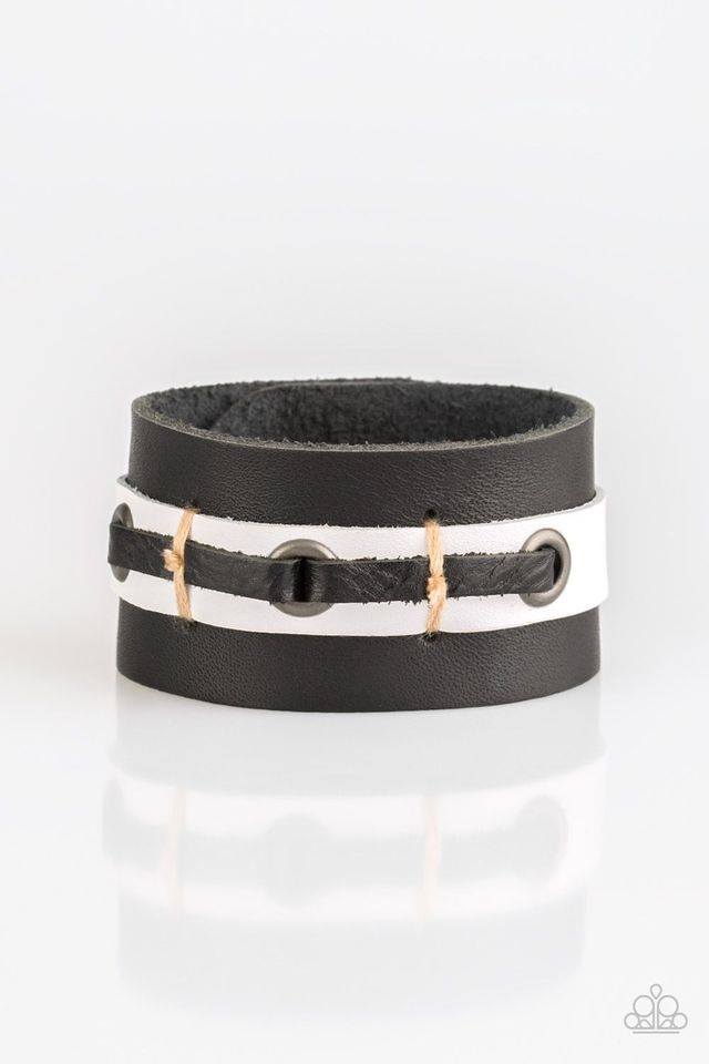 Una pieza de cuero blanco se sujeta a una banda de cuero negro con cordel y cordones de cuero para lograr un estilo resistente. Cuenta con un cierre a presión ajustable.
