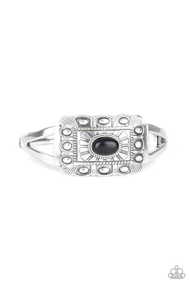 Un marco rectangular de plata con motivos de rayos de sol en relieve se asienta sobre un brazalete tipo brazalete para darle un toque estacional. Una piedra negra terrosa se presiona en el centro para lograr un acabado colorido. Cuenta con un cierre con bisagra.