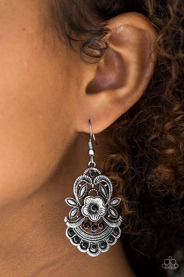 Delicadamente grabados y salpicados de texturas táctiles, los marcos plateados con hojas florecen en un marco floral veraniego. Delicadas cuentas negras salpican el marco de temporada para un acabado colorido. El pendiente se fija a un accesorio de anzuelo estándar.