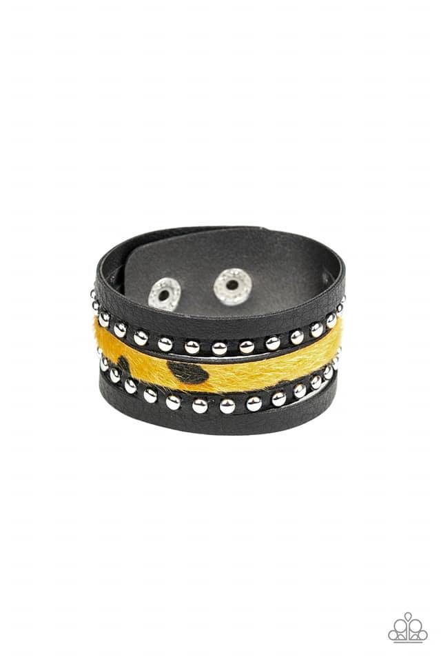 Una gruesa banda de cuero negro se ha unido en bandas en capas que se han tachonado y estampado con un estampado de guepardo difuso para lograr un aspecto salvaje. Cuenta con un cierre a presión ajustable.