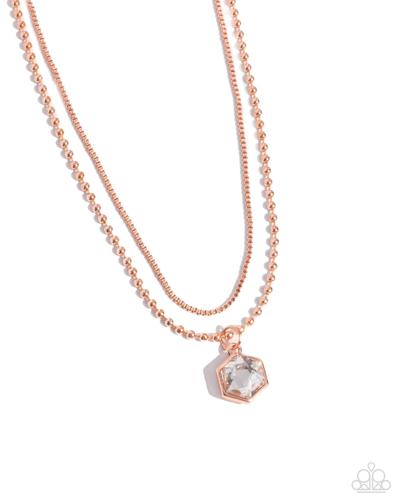 Gliding along a shiny copper ball chain, a hexagonal white gem combines with a shiny copper box chain layer for a daintily industrial display. Features an adjustable clasp closure.