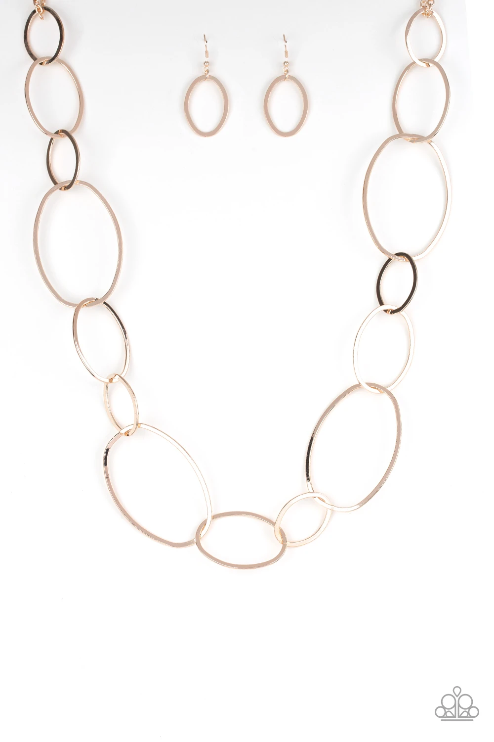 Los aros asimétricos de gran tamaño se balancean sobre cadenas dobles de oro rosa y se unen de manera espectacular en el pecho para lograr un estilo industrial refinado. Cuenta con un cierre de broche ajustable.