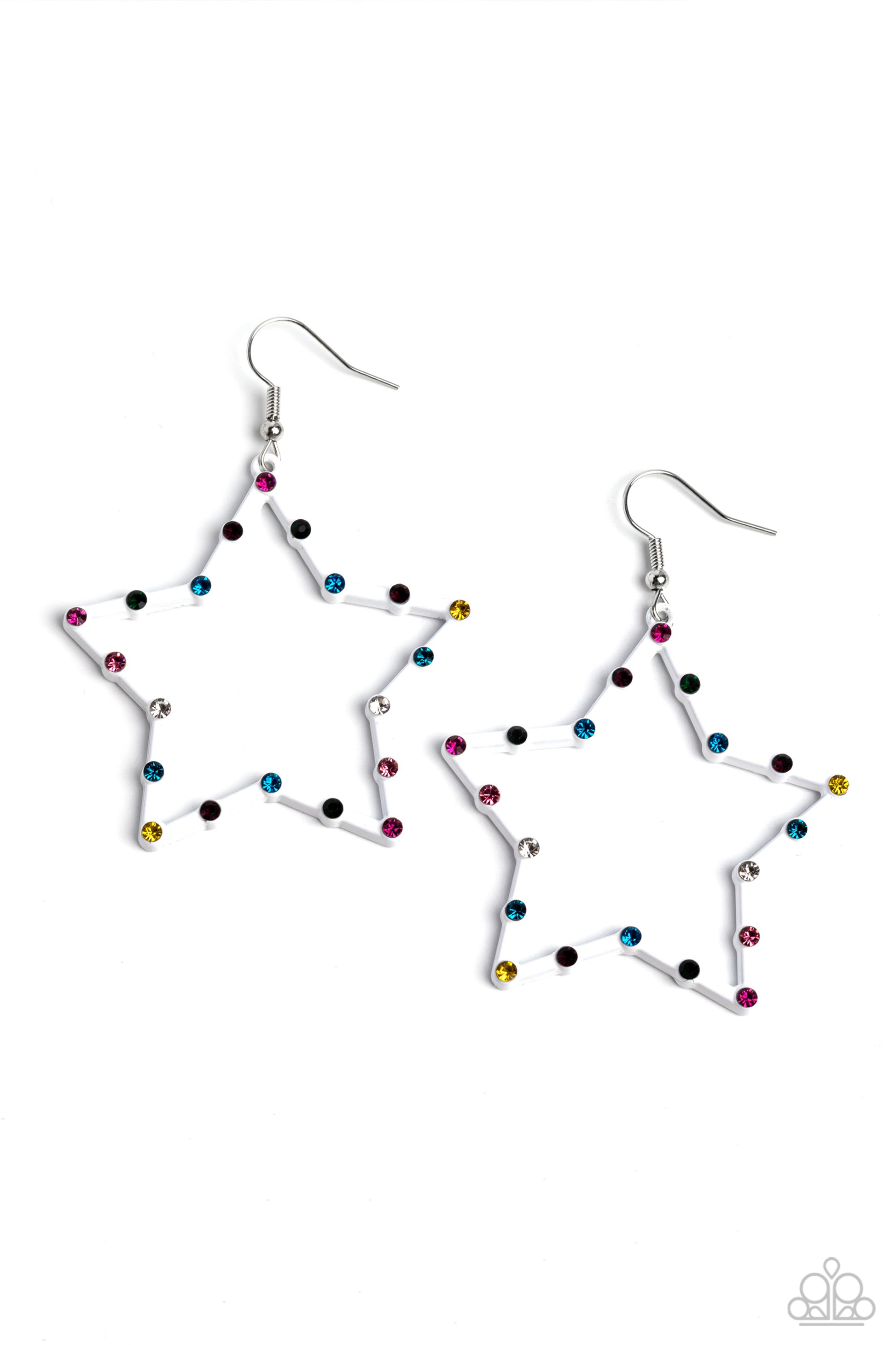 Los marcos de estrellas blancas, salpicados de delicados diamantes de imitación multicolor, reflejan la luz sobre su superficie de color para darle un toque de moda. Los pendientes se sujetan con un gancho estándar.