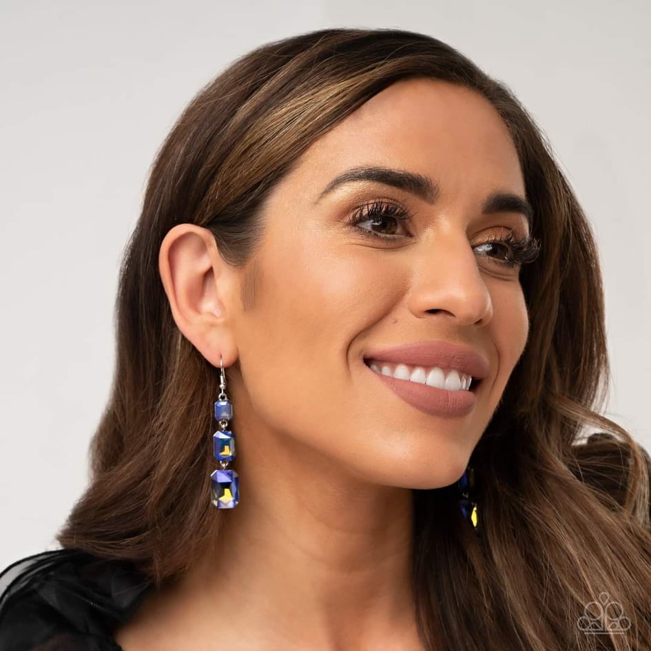 Con un deslumbrante brillo azul y dorado, un trío de gemas talladas en esmeralda en tamaños graduados se unen una debajo de la otra para lograr un espectacular acabado de alfombra roja. El pendiente se fija a un gancho estándar.