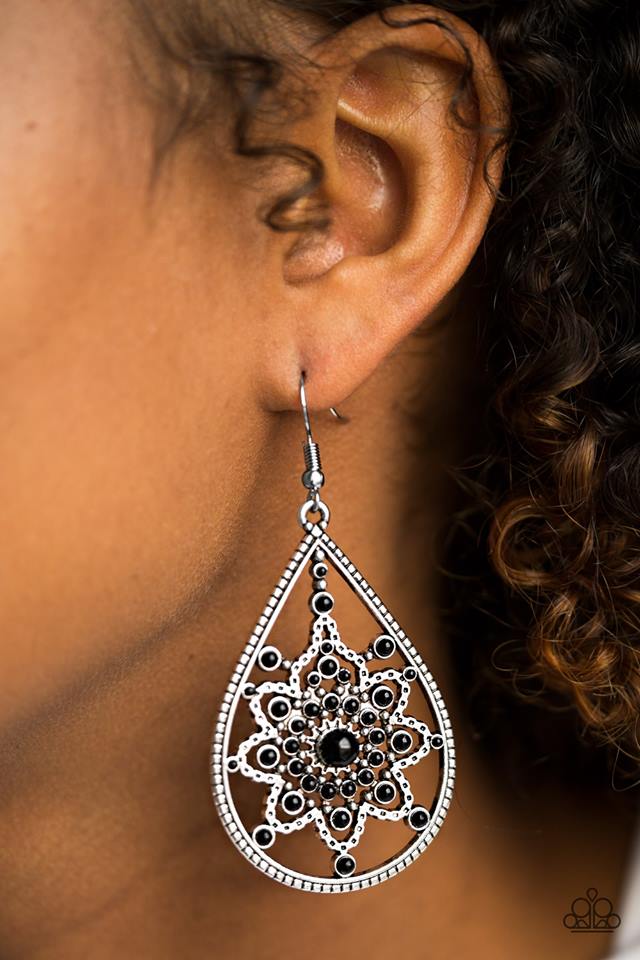 Las cuentas negras de color verde se presionan sobre un marco plateado brillante en forma de lágrima, creando un patrón floral caprichoso. El pendiente se fija a un accesorio de anzuelo estándar.
