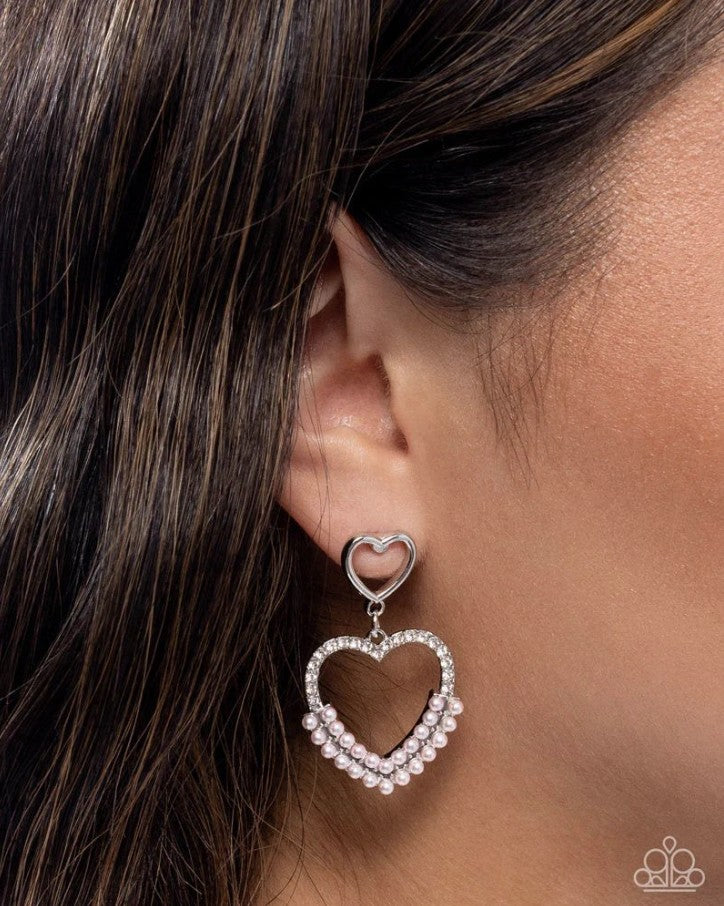 A heart-shaped silver frame sparkles with a row of white rhinestones and embellished with dainty baby pink pearl bead accents along the bottom edge, creating a romantic design. A smaller silver heart anchors the frame to the ear as it dangles for a touch of playful sophistication. Earring attaches to a standard post fitting.
