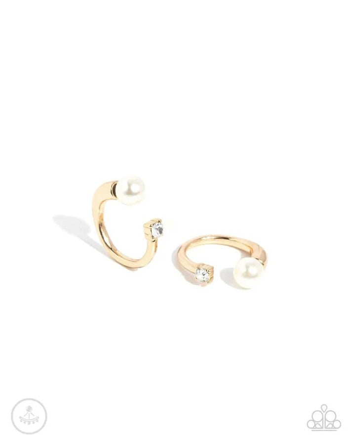 A solitaire glossy white pearl attaches to a double-sided gold hoop post, designed to fasten behind the ear. The glitzy double-sided post peeks out beneath the ear for a refined look, featuring a faceted dainty white rhinestone pronged in a square fitting for additional eye-catching detail. Earring attaches to a standard post fitting. Hoop measures approximately 3/4" in diameter.