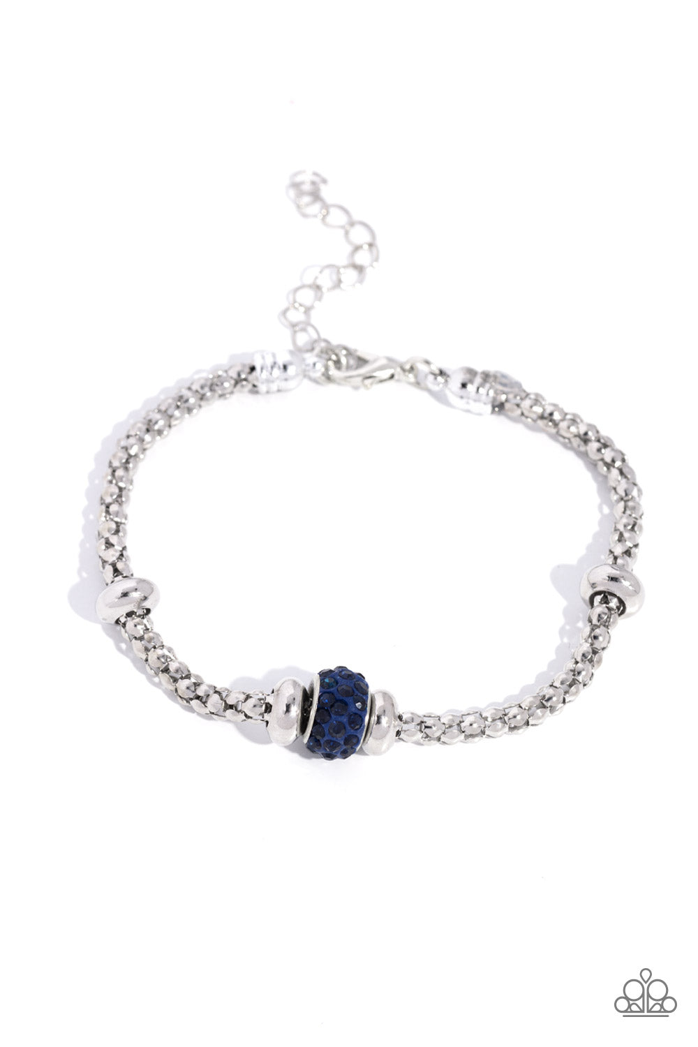Flanked by silver disc-like beads, a blue rhinestone dotted bead adorns the center of a silver popcorn chain around the wrist for a dazzling finish. Features an adjustable clasp closure.