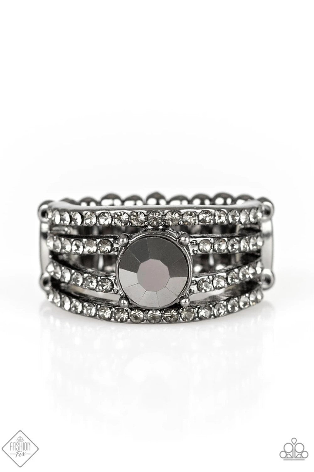 Fila tras fila de diamantes de imitación ahumados. Las bandas incrustadas recorren el dedo. Un diamante de imitación de hematita de gran tamaño se presiona en el centro de las bandas apiladas. Lo que le da un acabado llamativo. Cuenta con una banda elástica para un ajuste flexible.