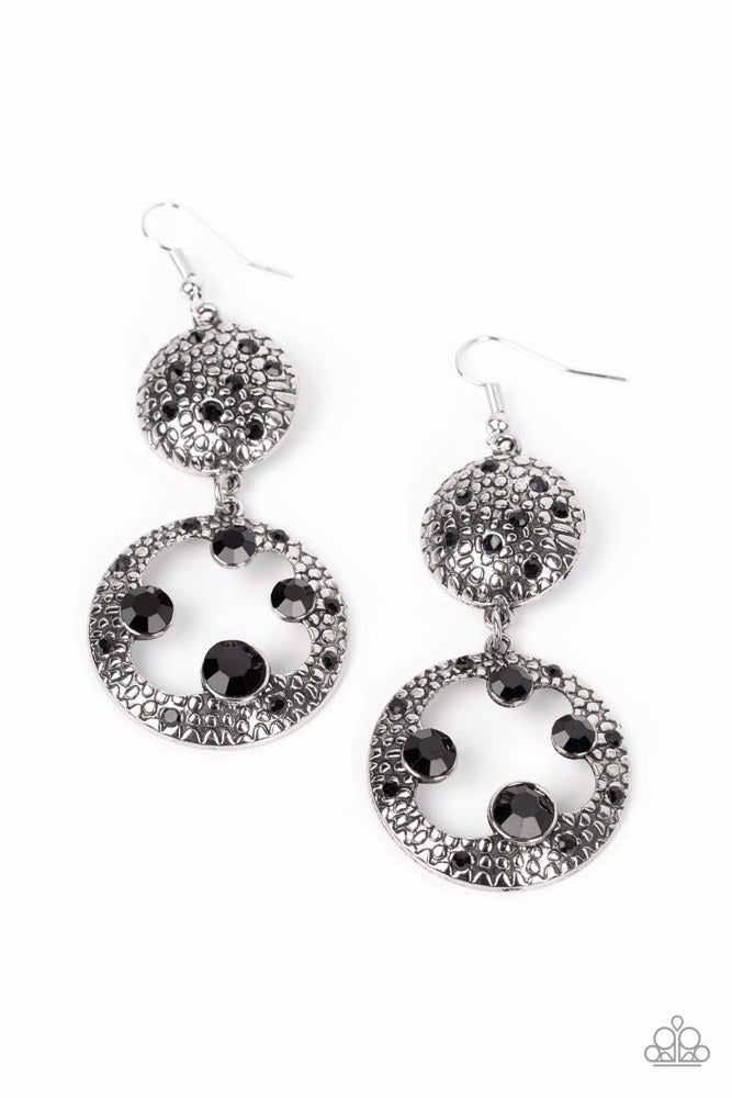 Un círculo plateado biselado, salpicado de delicados diamantes de imitación negros y grabado con texturas similares a guijarros, se adhiere a un aro plateado imperfecto con una textura a juego. Un puñado de diamantes de imitación negros de gran tamaño adornan el aro de forma aleatoria, lo que da como resultado un brillo arenoso. El pendiente se fija a un accesorio de anzuelo estándar.