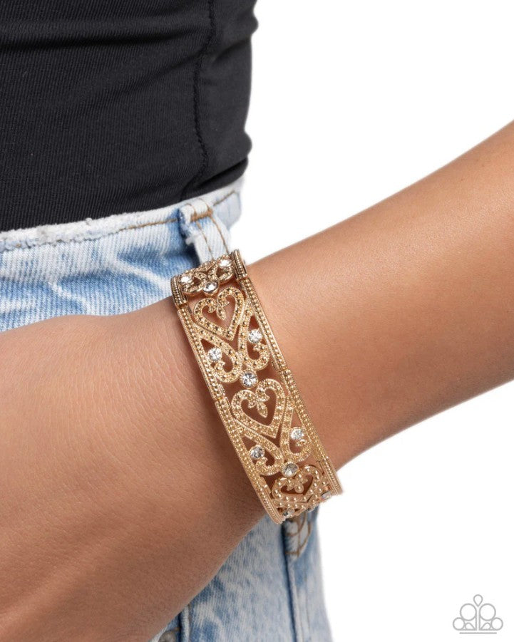 Threaded along stretchy bands, a series of ornate, heart-shaped filigree panels embellished with glistening white rhinestones encircles the wrist. The intricate detailing and symmetrical design bring an elegant touch to any look.
