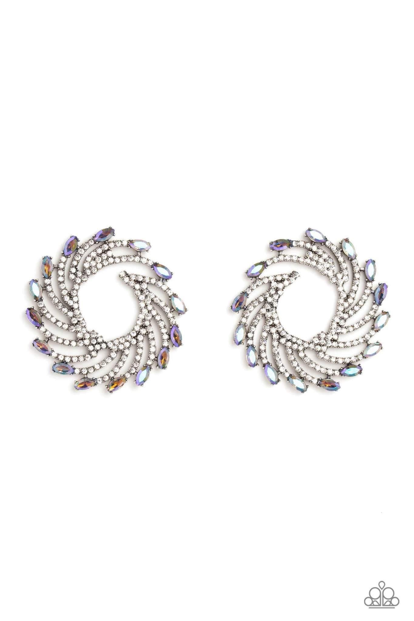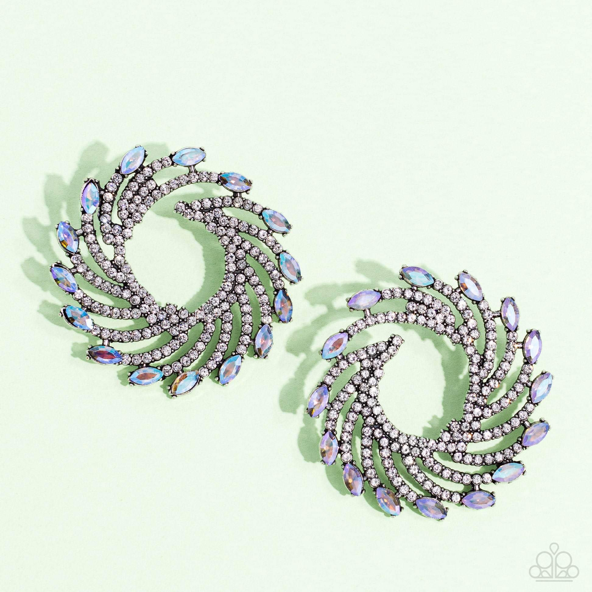Los hilos brillantes de plata se desenrollan desde un centro aireado, creando un espectáculo exagerado similar a un fuego artificial en la oreja. Una explosión de delicados diamantes de imitación blancos delinea los remolinos y curvas de la exhibición brillante que lleva la mirada a la colección de gemas de talla marquesa reflectantes de colores en sus extremos. Cada gema de talla marquesa reflectante de colores se enrosca alrededor de la oreja como un reloj, creando una dimensión llamativa adicional. El pendiente se fija a un ajuste de poste estándar. Debido a su paleta prismática, el color puede variar.