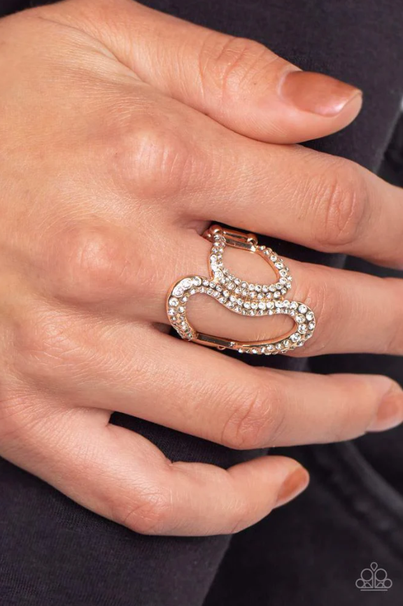 Las barras de oro relucientes se curvan asimétricamente a lo largo del dedo y se unen para formar una pieza central aireada que le da un aspecto de inspiración minimalista. Dos filas de delicados diamantes de imitación blancos incrustados a lo largo de las curvas de cada barra de oro brillan y relucen para lograr un acabado refinado. Cuenta con una banda elástica para un ajuste flexible.
