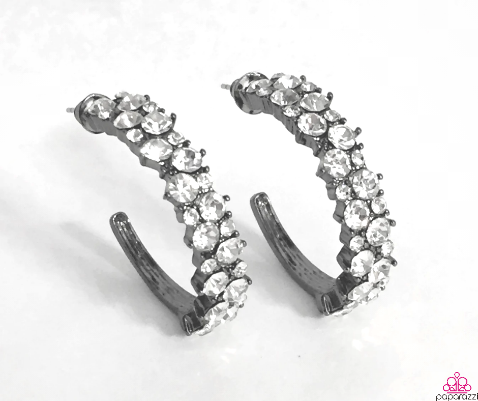 Un aro grueso de metal de cañón con incrustaciones de diamantes de imitación blancos se enrosca alrededor de la oreja para lograr un look glamoroso. El pendiente se fija a un pasador estándar. El aro mide 2,5 cm de diámetro.
