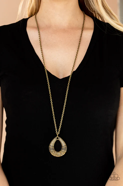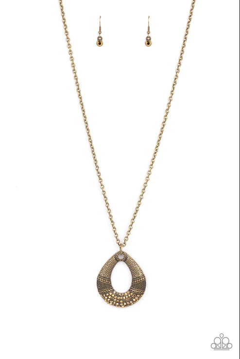 La parte inferior de una lágrima de latón martillado está tachonada y grabada con bandas de textura y tiene incrustaciones de diamantes de imitación de topacio dorado, lo que crea un colgante deslumbrante en la parte inferior de una cadena de latón alargada. Cuenta con un cierre de broche ajustable.
