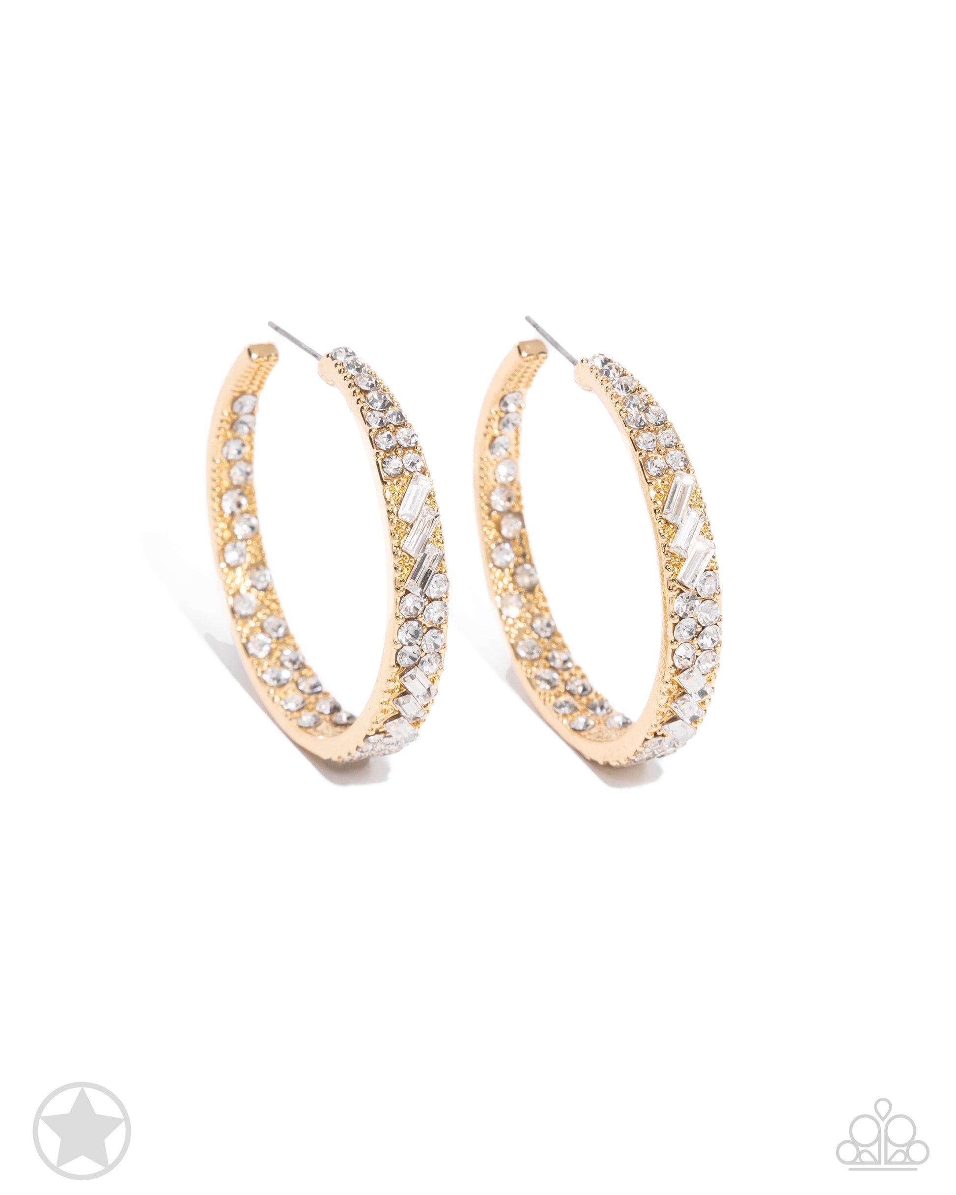 The front-facing surface of a chunky gold hoop is dipped in brilliantly sparkling white rhinestones while light-catching texture wraps around the back. The interior of the hoop features the opposite pattern, creating the illusion of a full hoop of blinding rhinestones. Earring attaches to a standard post fitting. Hoop measures 1 3/4" in diameter.