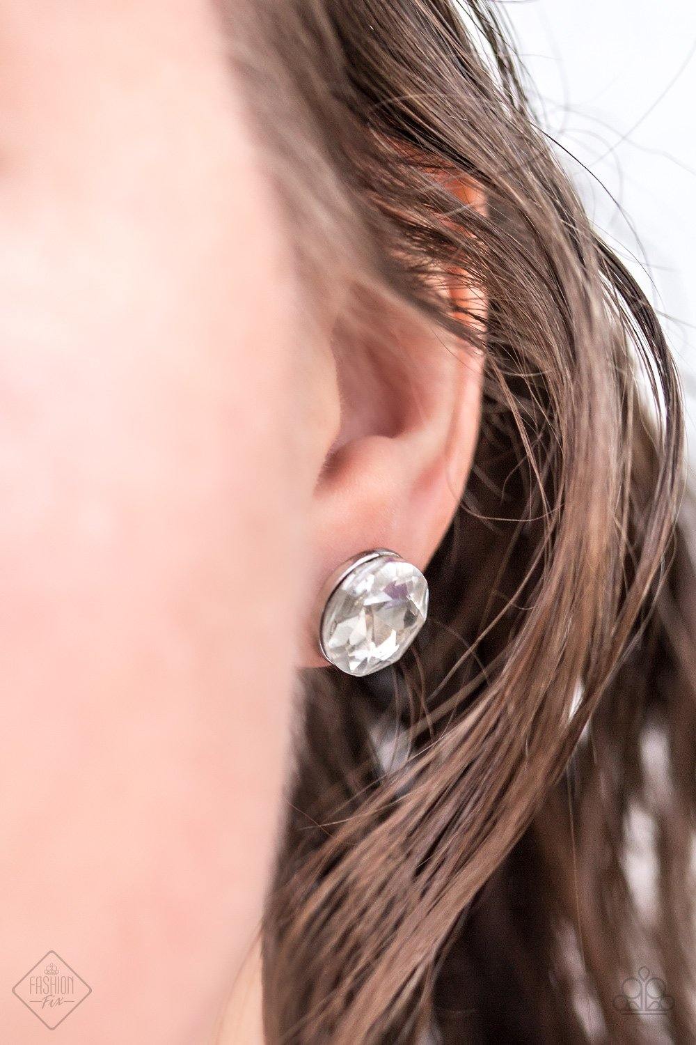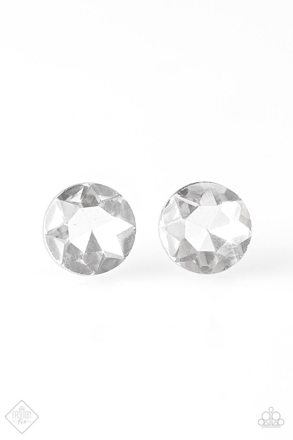 Un brillante diamante de imitación blanco se encuentra dentro de un marco plateado clásico para lograr un estilo atemporal. El pendiente se fija a un poste estándar.