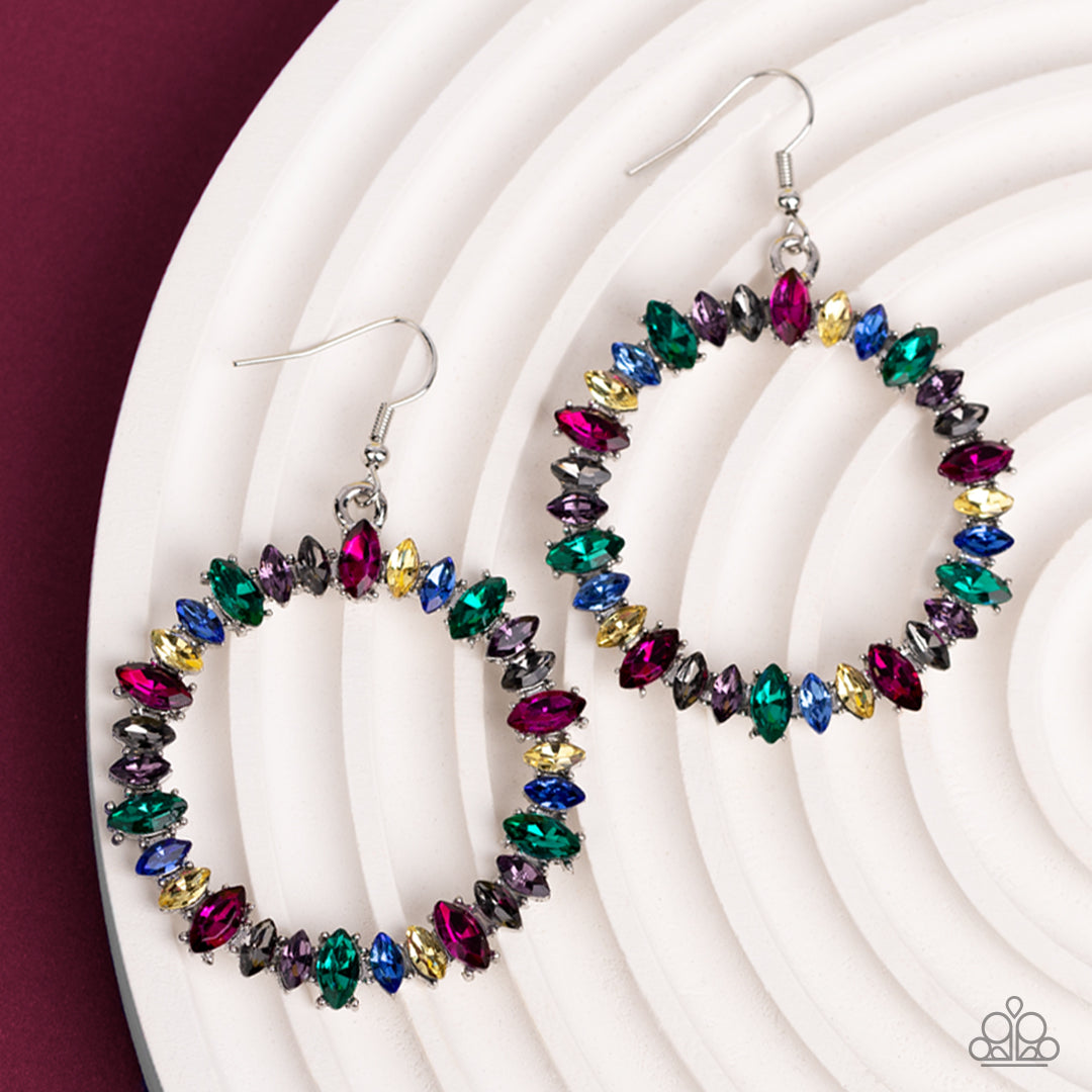 Engastados en accesorios de plata con púas, una brillante colección de diamantes de imitación de talla marquesa se fusionan delicadamente en un brillante aro multicolor para lograr un acabado espectacular. El pendiente se fija a un accesorio de anzuelo estándar.