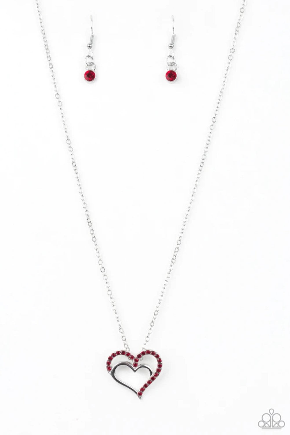Un corazón plateado brillante y un corazón con incrustaciones de diamantes de imitación rojos se unen para formar un romántico colgante debajo del collar. Cuenta con un cierre de broche ajustable.