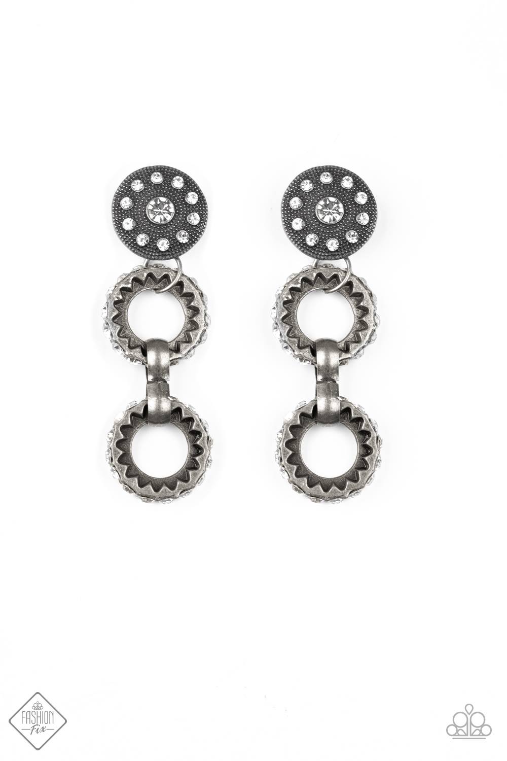 Con un acabado de hojalata rugosa, un par de anillos con incrustaciones de diamantes de imitación blancos se unen a la parte inferior de un marco de plata envejecida tachonado que irradia delicados diamantes de imitación blancos. El señuelo vanguardista se balancea desde la oreja, creando un diseño industrial. El pendiente se sujeta a un accesorio de poste estándar.