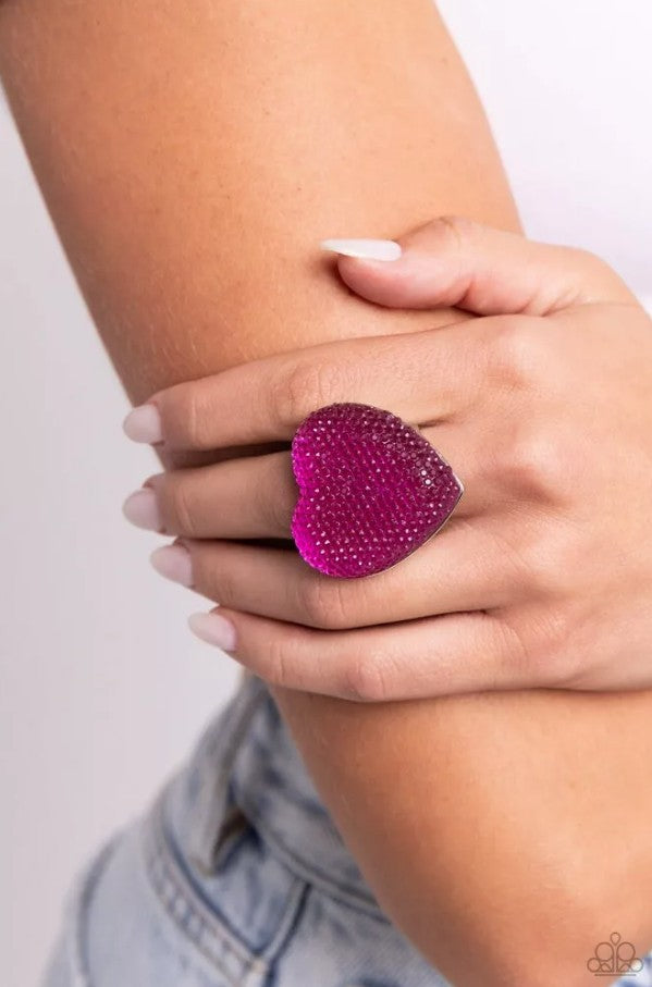 Bedazzled in fuchsia rhinestones, an exaggeratedly oversized fuchsia heart glitters atop the finger for a romantic centerpiece. Features a stretchy band for a flexible fit.