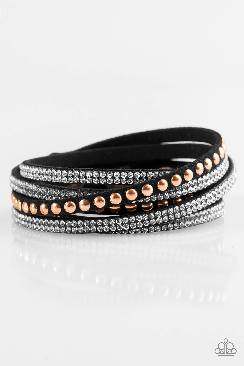Filas de brillantes diamantes de imitación blancos y brillantes tachuelas de cobre se colocan a lo largo de tres tiras de gamuza negra para lograr un look atrevido. La banda alargada permite un diseño moderno de doble vuelta. Cuenta con un cierre a presión ajustable.