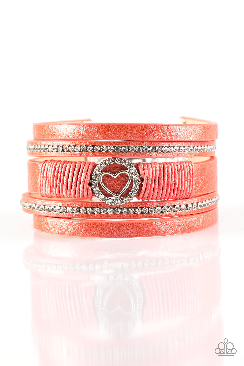 Las tiras de cuero naranja cepilladas con un brillo metálico están incrustadas en filas alternas de brillantes diamantes de imitación blancos. Los nudos de cordón naranja rodean la hebra más central y aseguran un marco de corazón brillante en su lugar para lograr un acabado extravagante. Cuenta con un cierre de broche ajustable.
