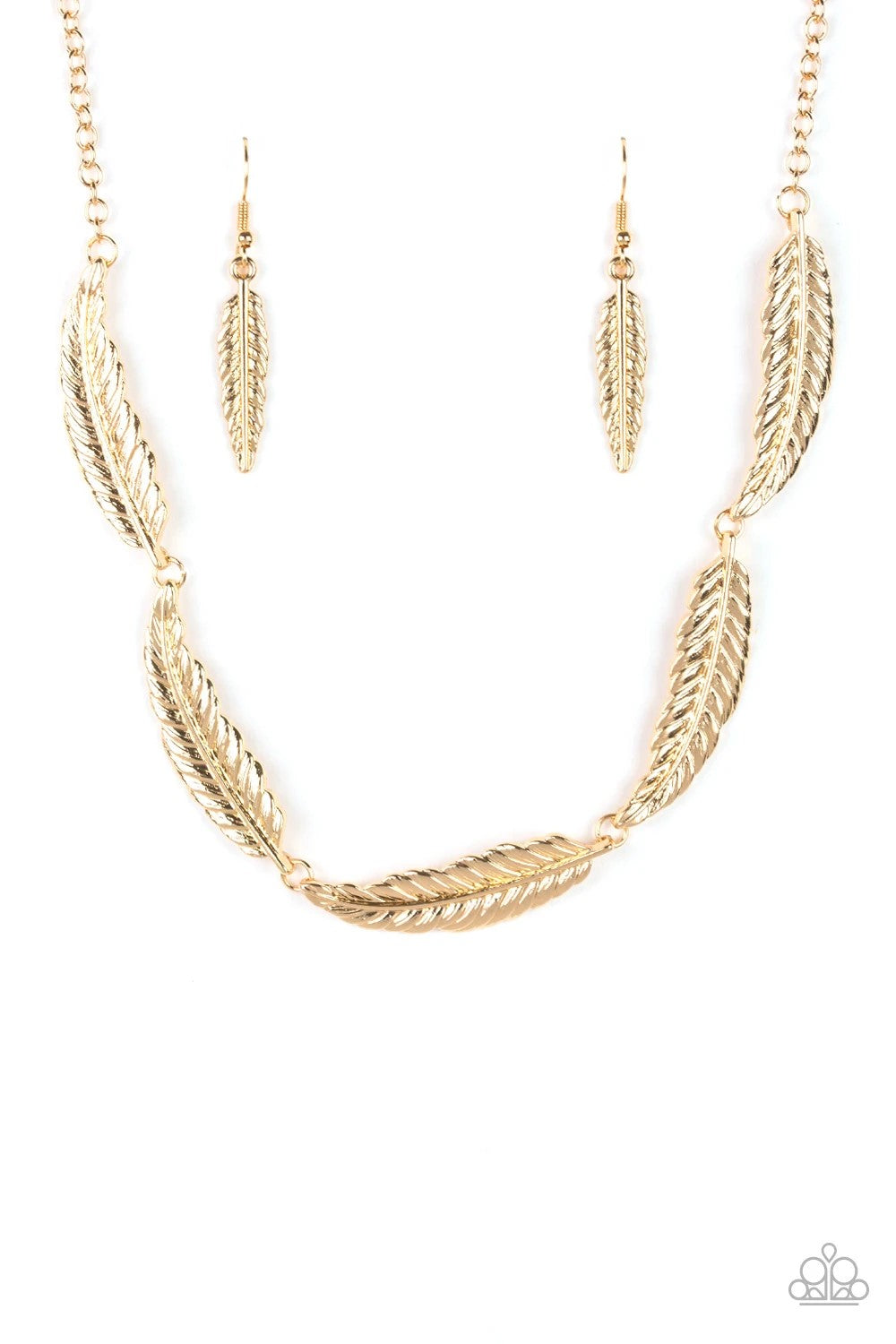 Plumas doradas realistas cepilladas con un brillo intenso se unen debajo del cuello a la moda de la temporada. Cuenta con un cierre de broche ajustable.