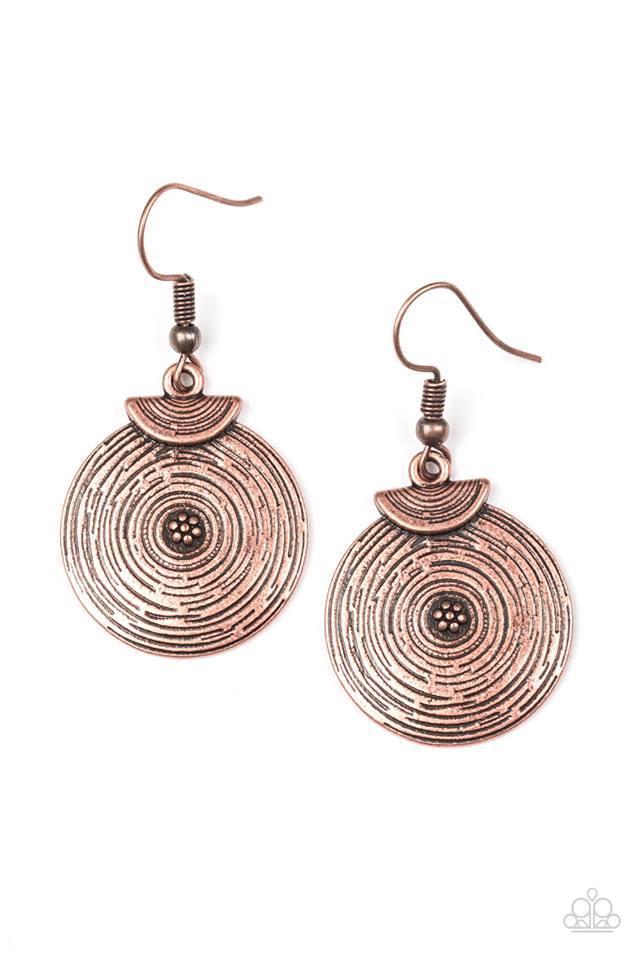 El marco de cobre brillante, con un delicado centro floral, irradia texturas antiguas para lograr un estilo de temporada. El pendiente se fija a un gancho estándar.