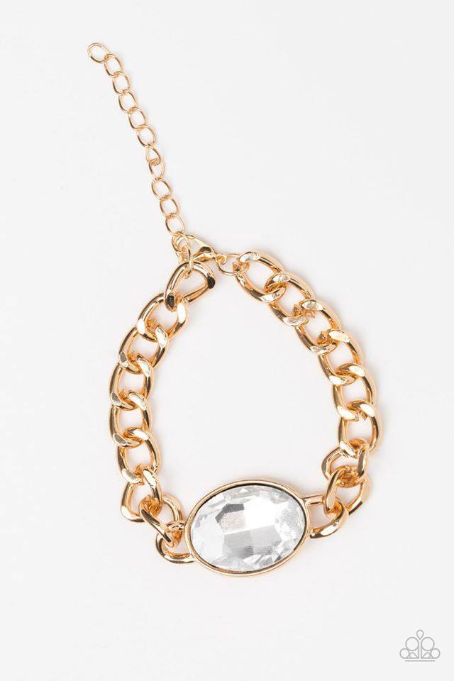 Una gema blanca de gran tamaño se une a una llamativa cadena de oro y crea una pieza central espectacular en la muñeca. Cuenta con un cierre de broche ajustable.