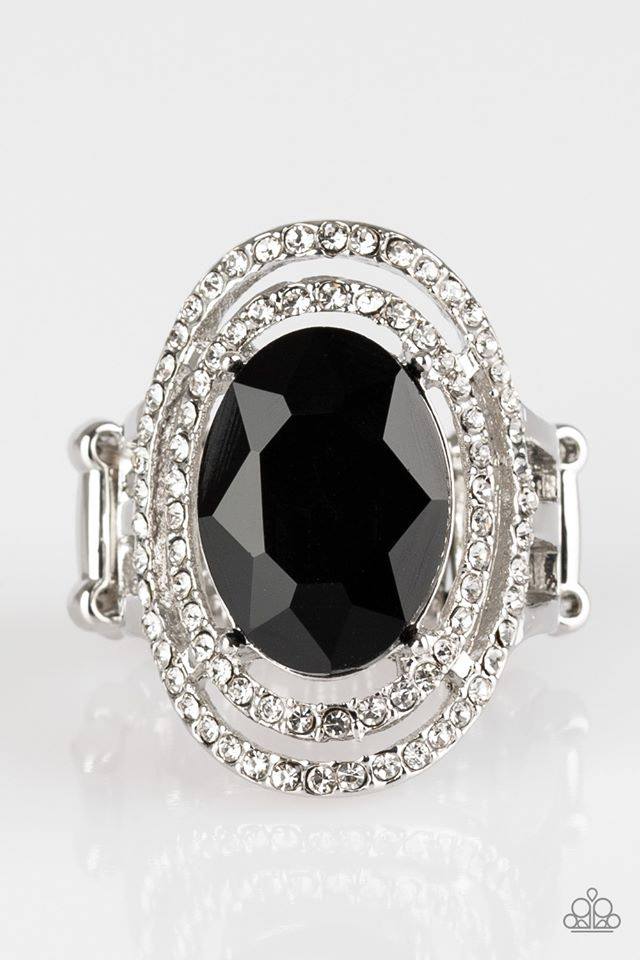 Una gema negra brillante se asienta sobre una montura plateada apilada que irradia diamantes de imitación blancos vidriosos para lograr un estilo atemporal. Cuenta con una banda elástica para un ajuste flexible.