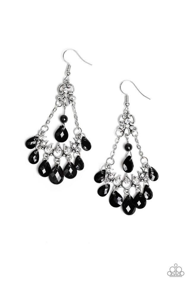 Cuentas negras facetadas en forma de lágrima cuelgan de la parte superior e inferior de marcos plateados ornamentados suspendidos por cadenas. Delicados diamantes de imitación blancos se encuentran esparcidos sobre la decoración de filigrana plateada en forma de lágrima para lograr un acabado caprichoso. El pendiente se fija a un accesorio de anzuelo estándar.
