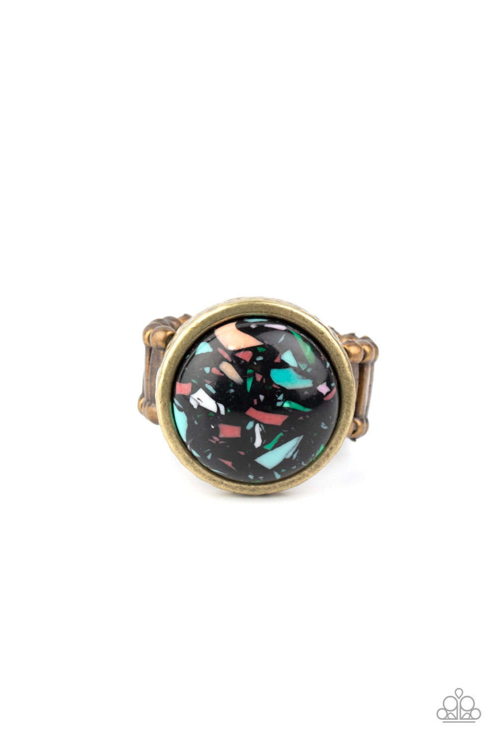 Con un acabado de imitación de mármol colorido, una cuenta negra moteada se presiona en el centro de un marco de latón martillado para lograr un aspecto moderno. Cuenta con una banda elástica para un ajuste flexible.