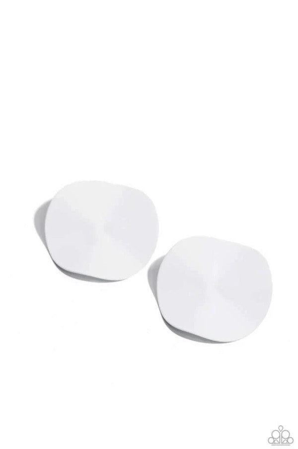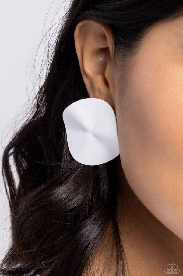 Featuring a matte white finish, a wavy metallic button gleams from the ear for an abstract, artistic statement. Earring attaches to a standard post fitting.