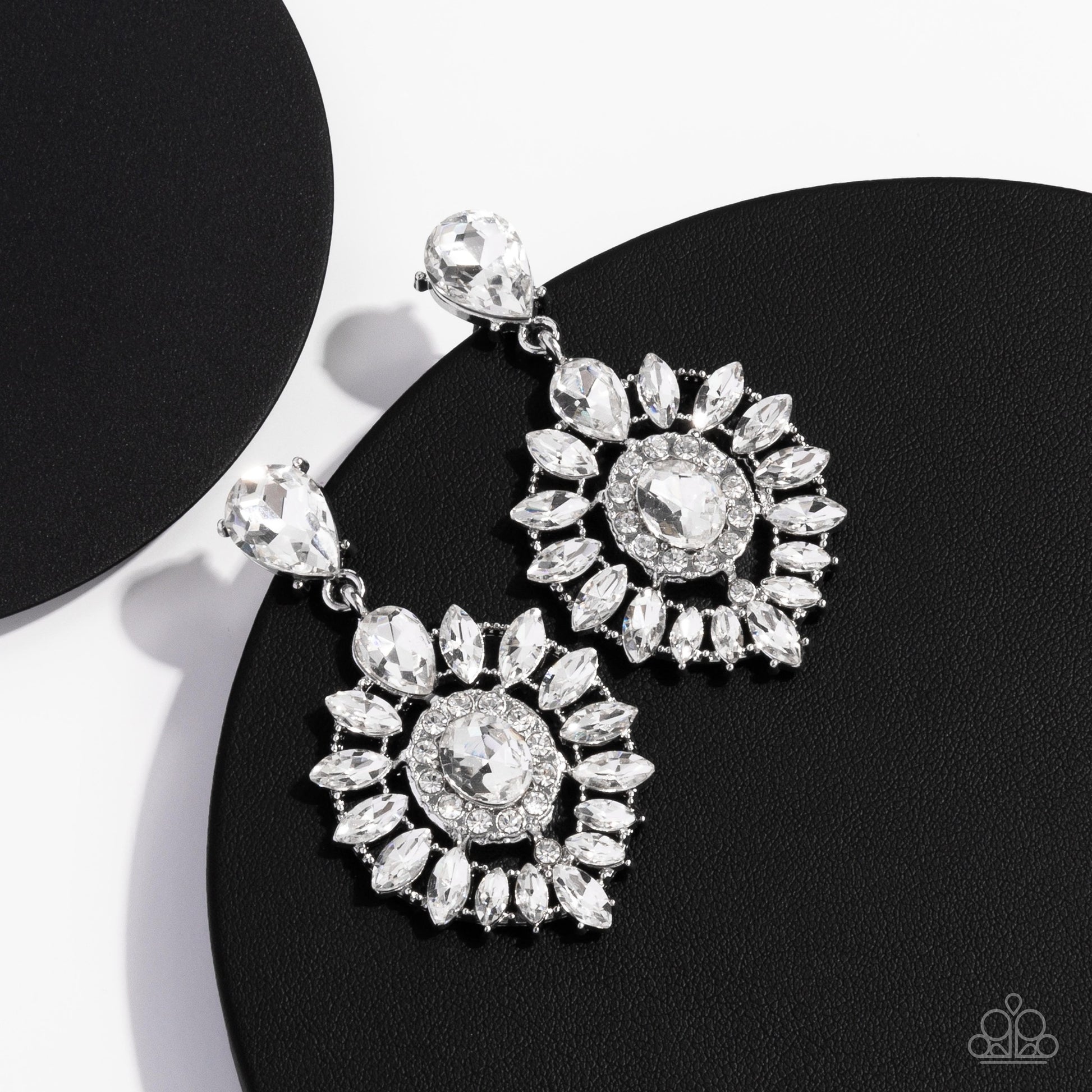 Enmarcado por delicados diamantes de imitación blancos, una gema blanca ovalada se presiona en el centro de una explosión de diamantes de imitación blancos de talla marquesa. El marco helado se balancea desde la parte inferior de un diamante de imitación solitario en forma de lágrima, lo que agrega un movimiento coqueto a la exhibición asombrosa. El pendiente se sujeta a un accesorio de poste estándar.