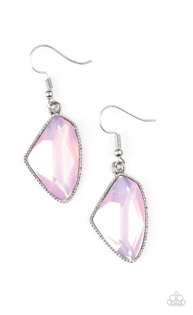 Con un brillo iridiscente, una gema rosa facetada está presionada en un elegante marco plateado, creando un señuelo caprichoso. El pendiente se fija a un accesorio de anzuelo estándar.