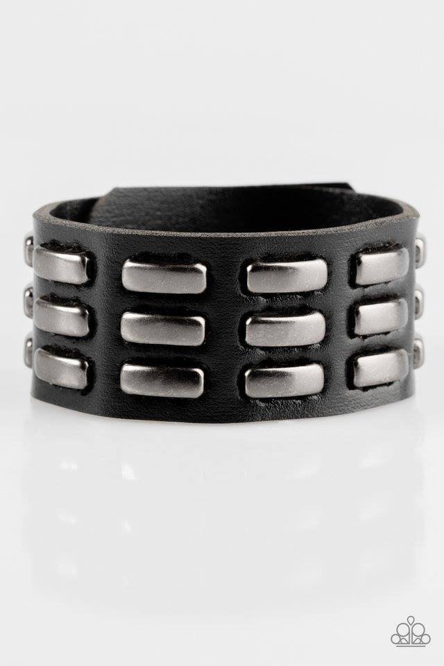 Los detalles metálicos brillantes se encuentran en la parte delantera de una gruesa correa de cuero negro para lograr un aspecto rústico. Cuenta con un cierre a presión ajustable.