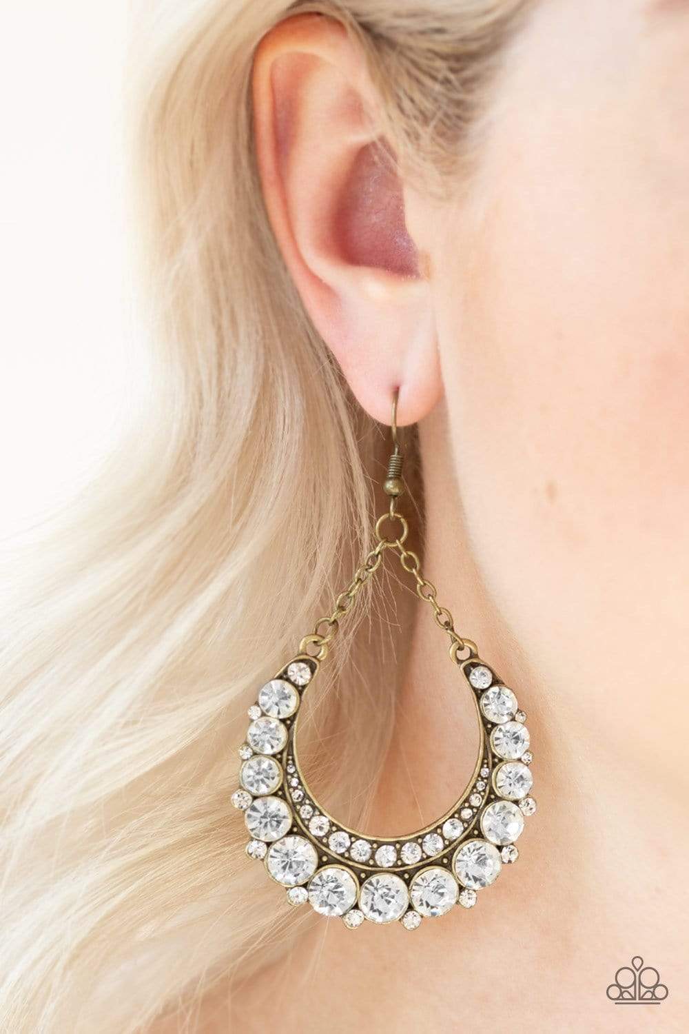 Como si estuviera bañada en purpurina, la parte inferior de un marco de latón con incrustaciones de diamantes de imitación blancos está adornada con una colección de diamantes de imitación blancos vidriosos. El glamoroso marco se balancea desde accesorios de cadena de latón para un acabado vanguardista. El pendiente se sujeta a un accesorio de anzuelo estándar.