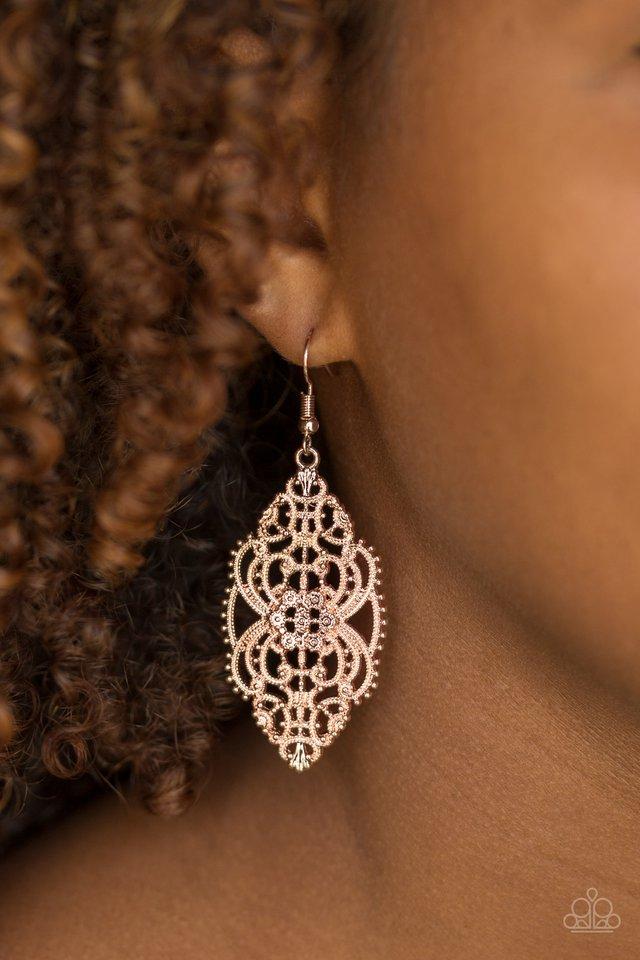 Cepillado con un brillo intenso, la filigrana de oro rosa con puntos se inclina y se arremolina en un marco majestuoso. El pendiente se fija a un accesorio de anzuelo estándar.