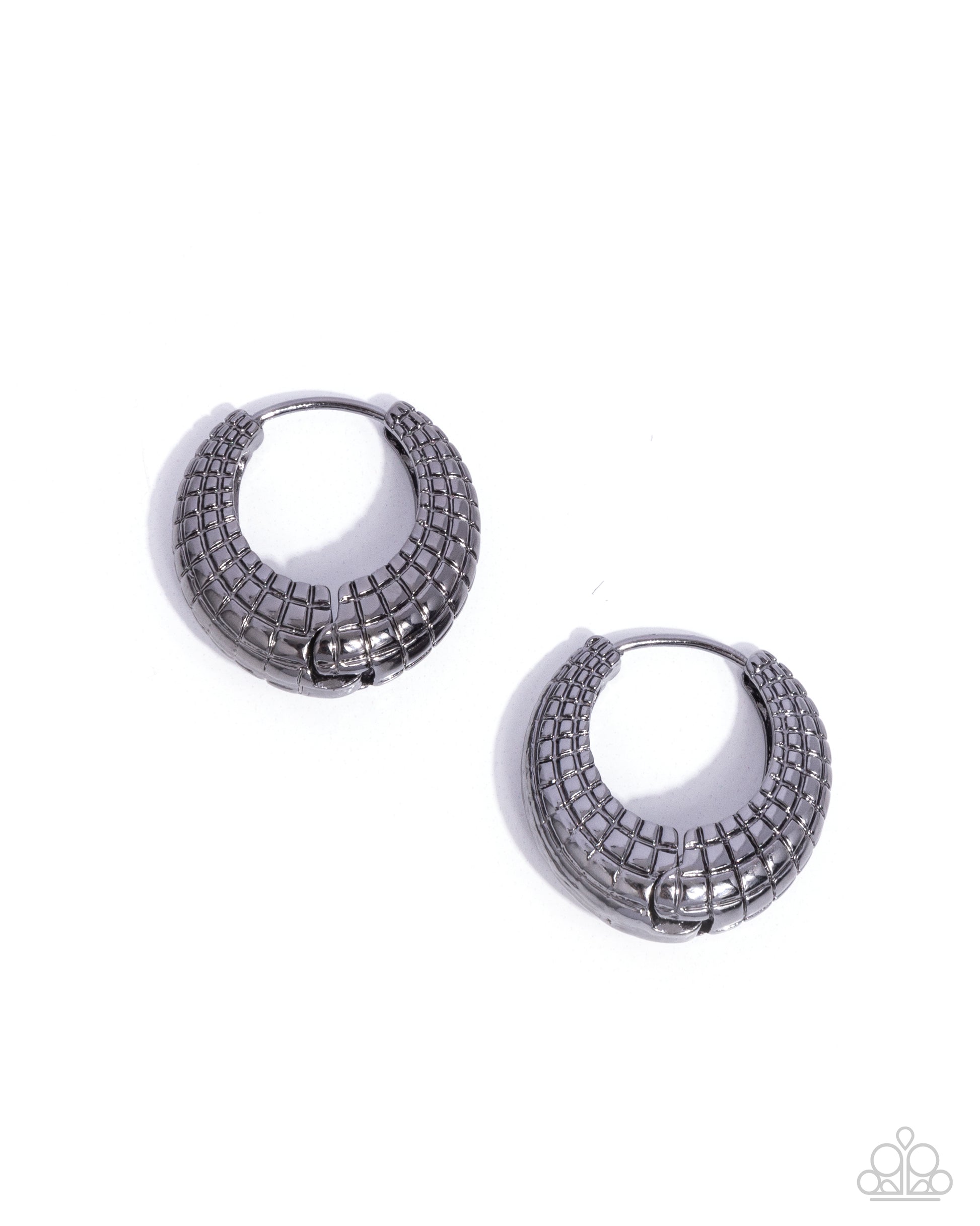 Featuring layers of high-sheen square texture, a glistening gunmetal hoop curls and hugs the ear for a perfectly patterned look. Earring attaches to a standard hinge closure fitting. Hoop measures approximately 3/4" in diameter.