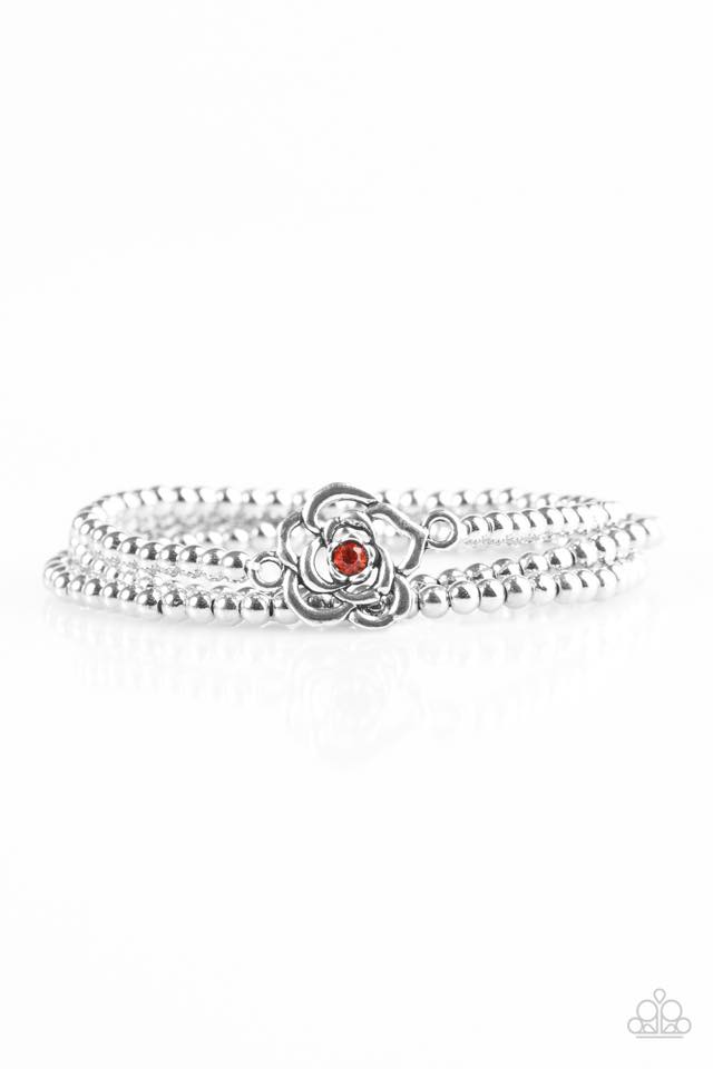 Delicadas cuentas de plata se ensartan a lo largo de bandas elásticas. Un dije floral plateado brillante adorna una hebra con un centro de diamantes de imitación de color naranja brillante, creando una pieza central extravagante sobre la muñeca.