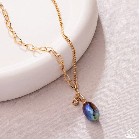 Intersecting a gold paperclip chain, a classic gold chain completes the neckline-encircling display, giving way to a solitaire light peach rhinestone in a gold fitting and an ombré-splashed oval pendant that fades from brown to purple for an adorably abstract display. Features an adjustable clasp closure.