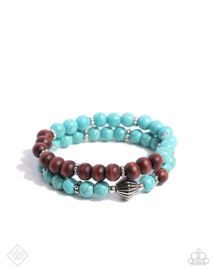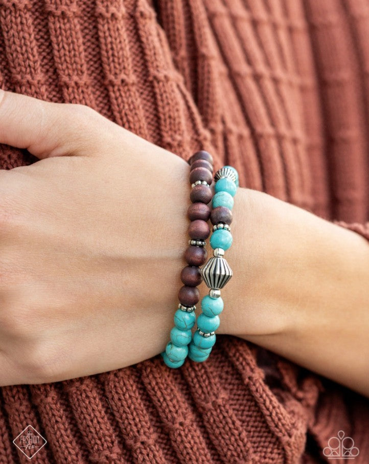 Infused along elastic stretchy bands, a collection of silver beads, textured silver beads, silver floral beads, wooden beads, and turquoise stone beads stack up the wrist for a free-spirited flourish. As the stone elements in this piece are natural, some color variation is normal.