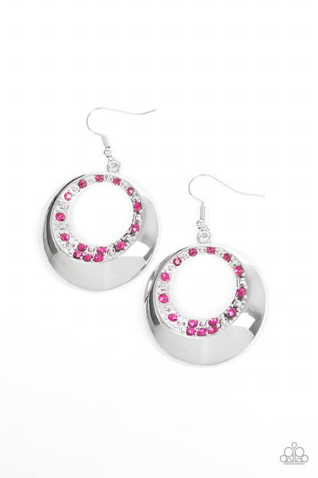 El interior de un aro plateado brillante está adornado con tachuelas plateadas y brillantes diamantes de imitación rosados para lograr un aspecto refinado. El pendiente se fija a un gancho estándar.