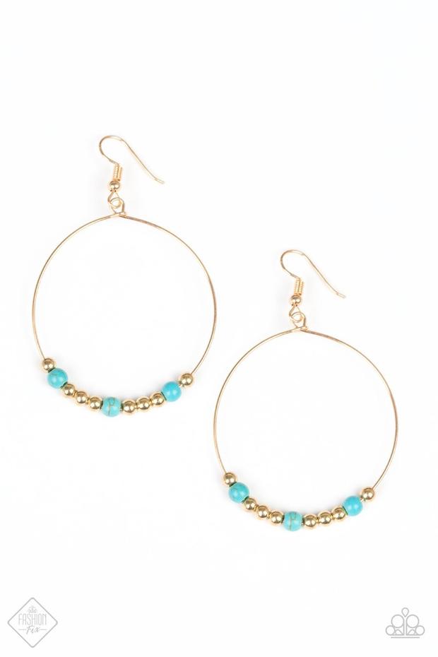 Una colección de delicadas cuentas de oro y refrescantes piedras turquesas se ensartan a lo largo de un delicado alambre de oro, creando un delicado aro hecho a mano. El pendiente se fija a un accesorio de anzuelo estándar.
