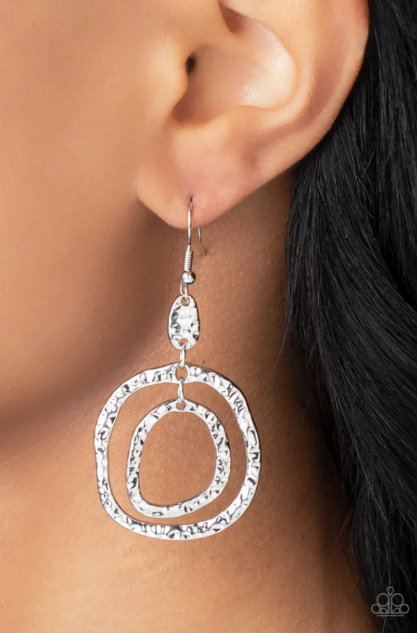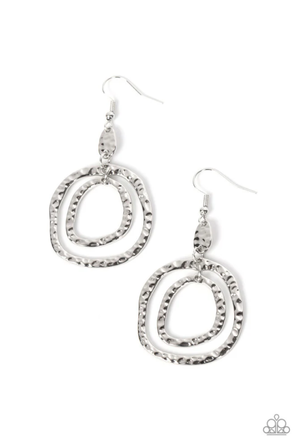 Un par de aros asimétricos martillados con un brillo táctil caen en cascada desde la parte inferior de un accesorio martillado a juego para lograr un estilo artesanal. El pendiente se fija a un accesorio de anzuelo estándar.
