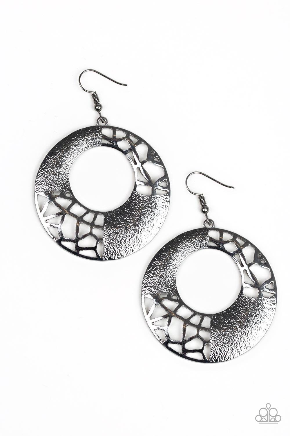 Con secciones de patrones metálicos destrozados, un aro grueso de bronce cuelga de la oreja con un estilo industrial vanguardista. El pendiente se sujeta a un accesorio de anzuelo estándar.