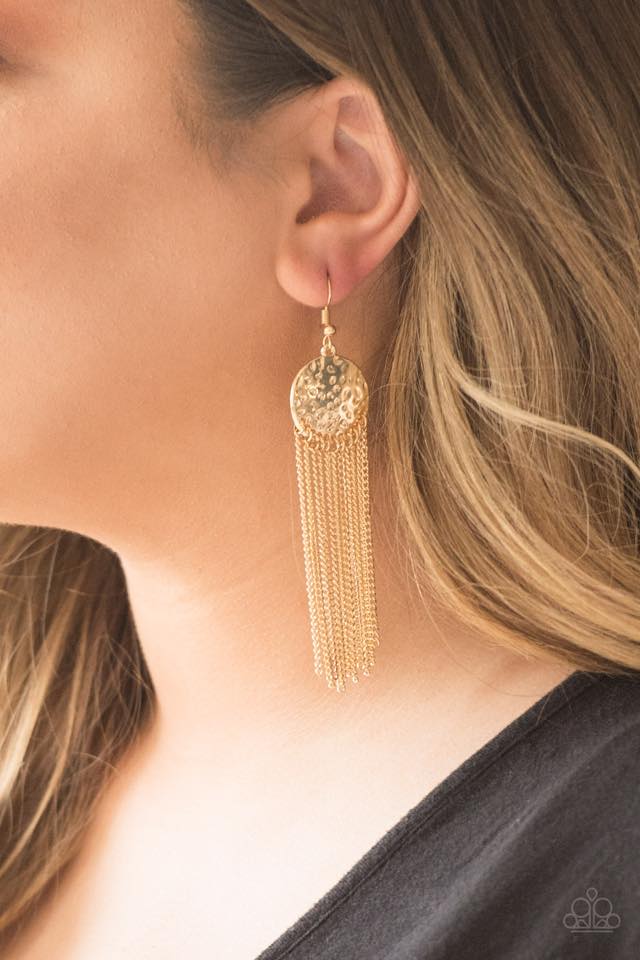 Cadenas de oro brillante fluyen desde la parte inferior de un marco de oro delicadamente martillado, creando un fleco informal. El pendiente se fija a un gancho estándar.