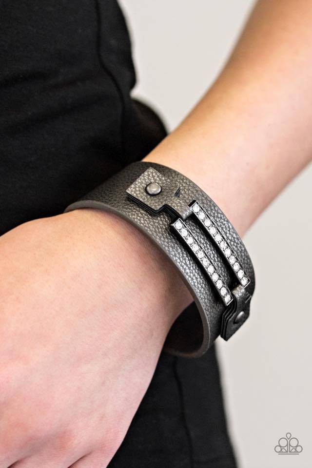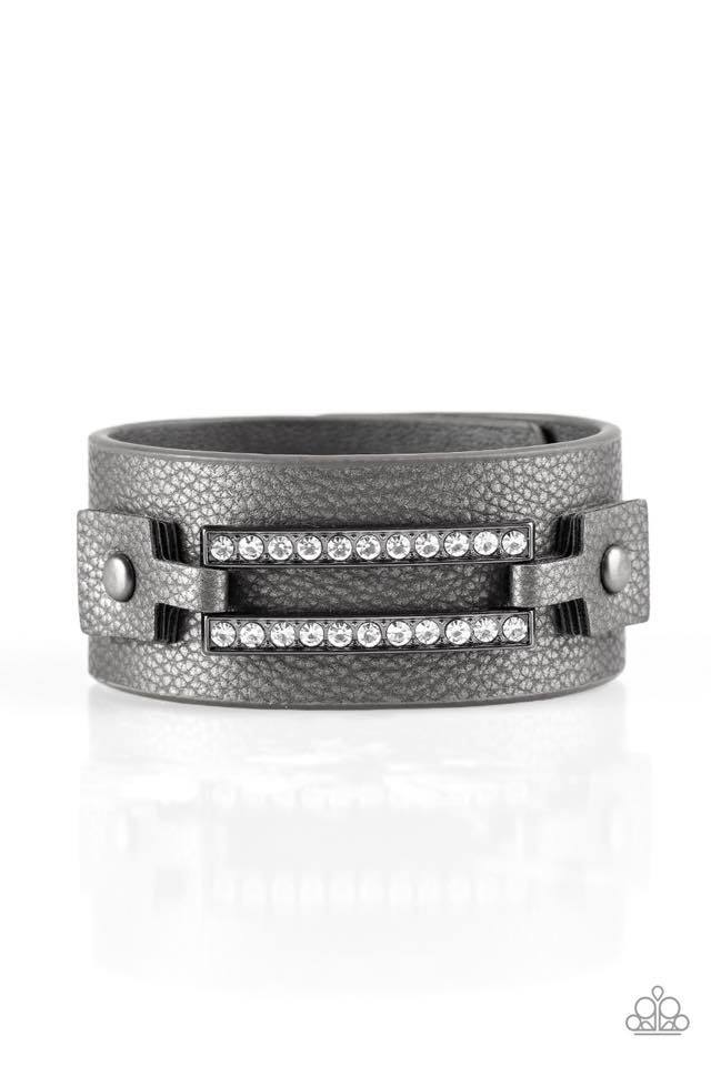 Con incrustaciones de brillantes diamantes de imitación blancos, un marco de metal brillante está tachonado en su lugar en la parte delantera de una banda gris metálica para lograr un aspecto atrevido. Cuenta con un cierre a presión ajustable.